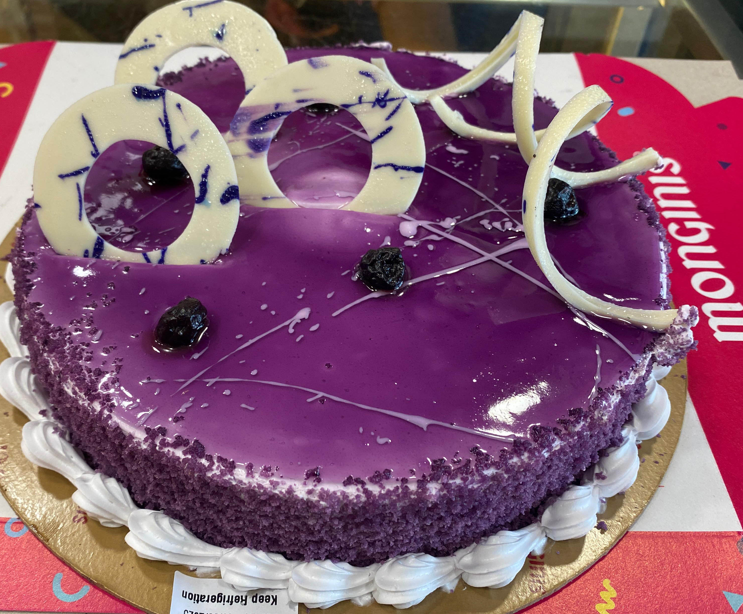 A delicious blueberry cake with moist sponge, creamy frosting and a generous layer of fresh blueberries.