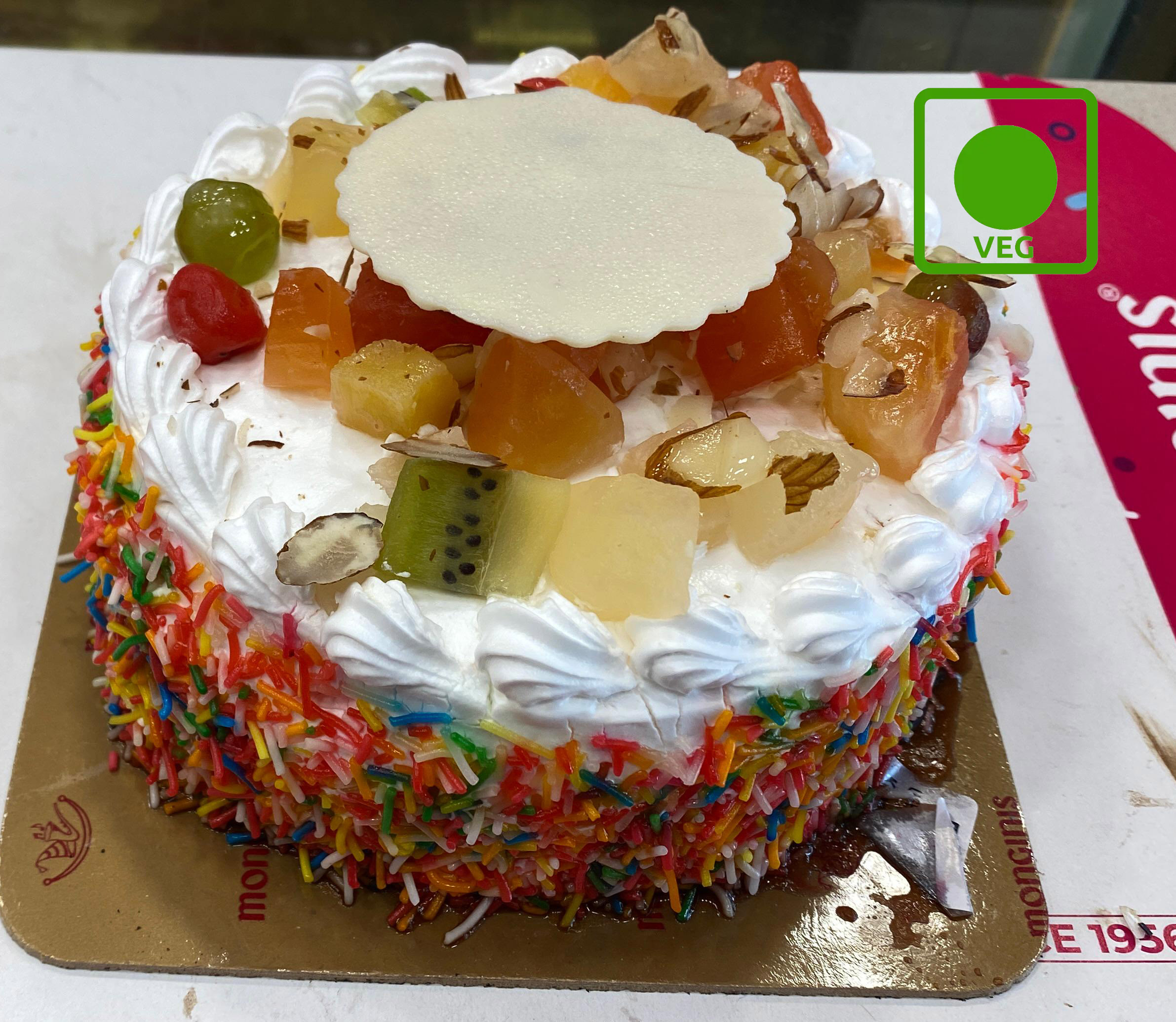 A vibrant fresh fruit cake with layers of soft sponge, creamy frosting and a variety of fresh with juicy fruits.